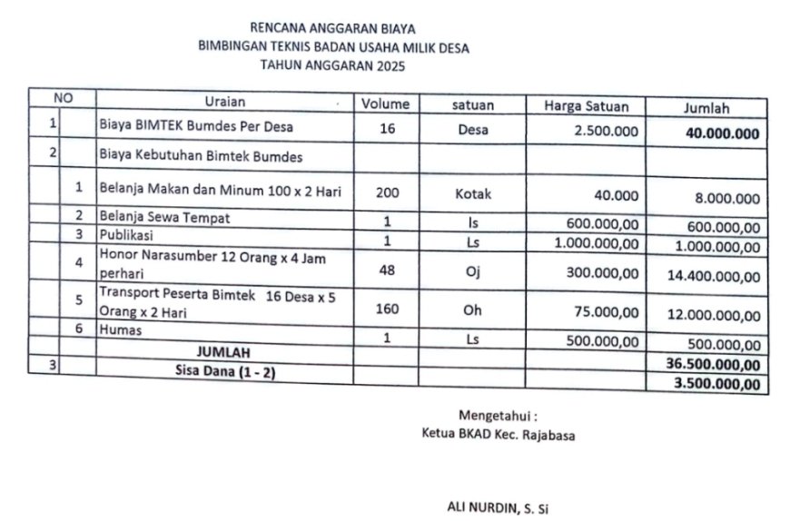 Mencuatnya pro dan kontra tersebut, terkait anggaran yang menelan puluhan juta kisaran Rp 40 juta. Dalam dokumen RAB tercatat total kebutuhan biaya sebesar Rp36.500.000, dengan sisa dana Rp3.500.000. Rincian anggaran menunjukkan bahwa honor narasumber sebesar Rp14.400.000 (12 narasumber × 4 jam × Rp300.000/jam) menyerap hampir 40 persen dari total anggaran. Sementara itu, transport peserta sebesar Rp12.000.000 (16 desa × 5 peserta × 2 hari × Rp75.000) dan konsumsi sebesar Rp8.000.000 (200 kotak × Rp40.000) turut menjadi pos dominan. Adapun sewa tempat Rp600.000, publikasi dan dokumentasi Rp1.000.000, serta koordinasi dan operasional Rp500.000 melengkapi struktur belanja kegiatan.
