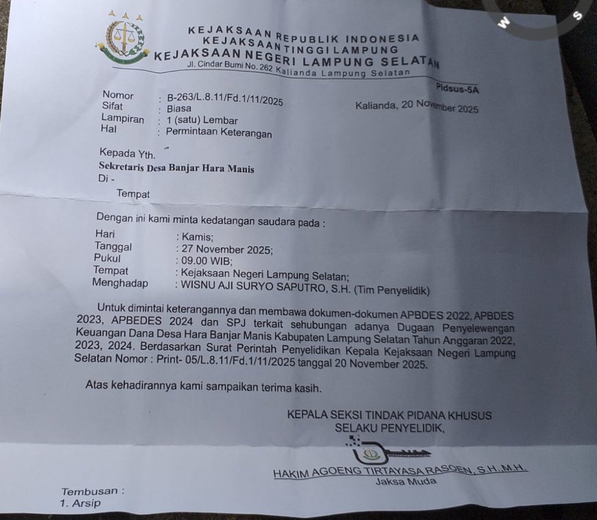 Kekeliruan muncul dalam Surat Pemanggilan Nomor B-263/L.8.11/Fd.1/11/2025, tertanggal 20 November 2025. Alih-alih mencantumkan nama Desa Hara Banjar Manis, sebagaimana tujuan pemanggilan, surat itu tercetak dengan nama desa yang salah yakni, 'Desa Banjar Hara Manis'